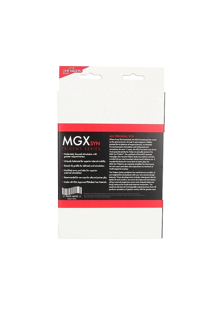 Aneros MGX Syn Trident je stimulátor prostaty s ergonomickým designem, který přesně zasáhne váš bod P pro lahodný orgasmus. Stimulátor prostaty je vyroben z měkkého silikonového materiálu a má tvrdý, neohebný dřík s pružnými konci, který bude stimulovat perineum. MGX Syn Trident je ideální pro zábavu s partnerem, ale také pro sólo hry. Žebrované dno poskytuje další větší stimulaci. Nebojte se používat MGX Syn Trident ve sprše nebo ve vaně, protože je voděodolný.