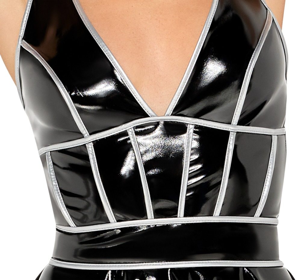 Black Level Vinyl Dress Krátké šaty od značky Black Level z černého vinylu se stříbrnými ozdobnými švy.  Otevřená záda, hluboký výstřih a rozšířená sukně. Proč si vybrat Vinyl Dress od Black Level: Krátké šaty vyrobené…