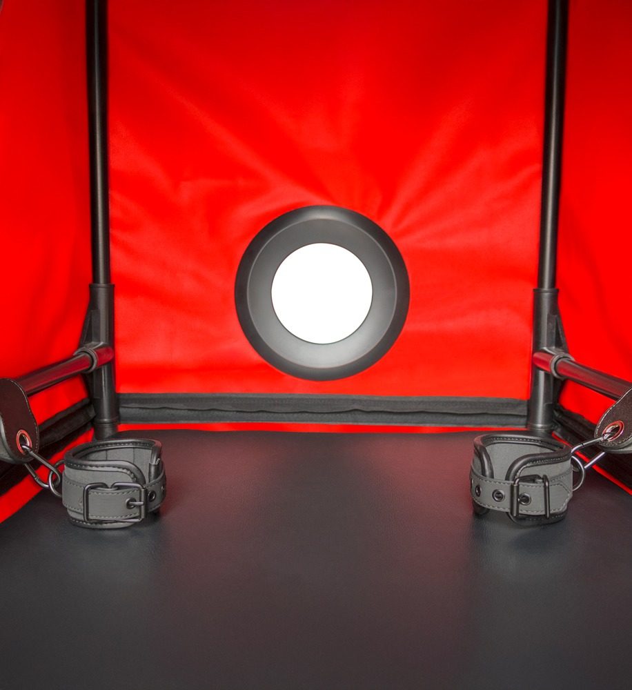 Robustní rám s jednoduchým zasouvacím systémem a odolnými panely zajistí rychlé sestavení a okamžité použití. Otvor na hlavu je vybaven zipem a širokým nastavitelným límcem, boční stěny obsahují další přístupové otvory. Uvnitř vás čeká měkká podložka a LED osvětlení, které vytvoří pohodlné a intimní prostředí pro vaše fantazie.