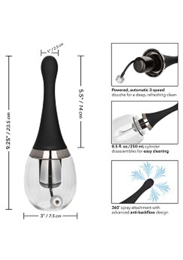 Abyste si užili vše, co vzrušující svět anální hry nabízí, musíte se připravit na zajištění naprosté čistoty, bezpečí a spokojenosti. Už si nikdy nedělejte starosti s malými nehodami, které zkazí náladu, místo toho dovolte, aby vám Ultimate Rechargeable Auto Douche od CalExotics poskytla vynikající zážitek z čištění. Tento plně automatický čisticí systém zahrnuje pokročilý design proti zpětnému toku vytvořený pro hloubkové čištění jako žádný jiný. Výkonný čisticí systém je doplněn 3rychlostními režimy průtoku, 360° vícesměrným nástavcem a nádržkou, která pojme až 250 ml. Bez ohledu na to, jak a kde jej používáte, design je navržen tak, aby bez úniku fungoval, i když je převrácený. Snadno se používá, snadno se čistí a lze ji pro čištění rozebrat. Před a po každém použití omyjte sondu a nádržku zevnitř i zvenčí teplou vodou a mýdlem a poté vydezinfikujte. Nabije se za pouhé 2 hodiny pro až 1 hodinu vysokorychlostního proudění nebo 1,5 hodiny nízkorychlostního čištění.