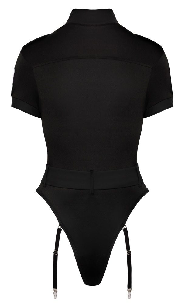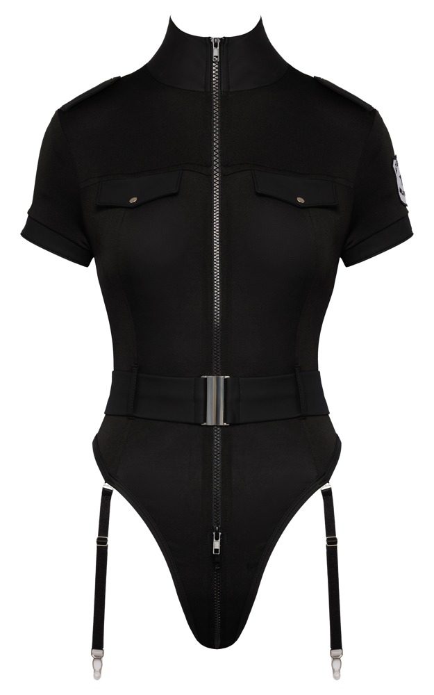 Černé podvazkové body od Cottelli COSTUMES ve stylu speciální policie s výraznou nášivkou na levém rameni. Vyrobené z měkkého elastického materiálu kombinovaného s matným a lesklým wetlook efektem. Body má přísný vzhled s vysokým stojáčkem a polorukávy. Ramenní a hrudní klapky dodávají typický policejní vzhled. Součástí jsou poutka pro přiložený elastický pásek s elegantní stříbrnou sponou. Trojité zipové zapínání vede od vysokého stojáčku až do rozkroku. Podvazky jsou nastavitelné a lze je z body úplně odejmout.