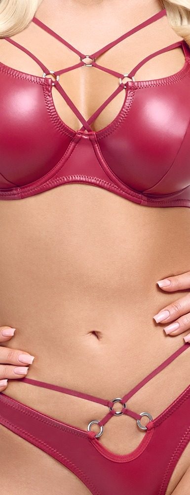 Dopřejte si luxusní kombinaci smyslnosti a elegance s touto sofistikovanou sadou od Cottelli LINGERIE. Červený wetlook materiál s lesklým efektem přitahuje pohledy, zatímco rafinované pásky a ozdobné stříbrné kroužky dodávají modelu exkluzivní vzhled.