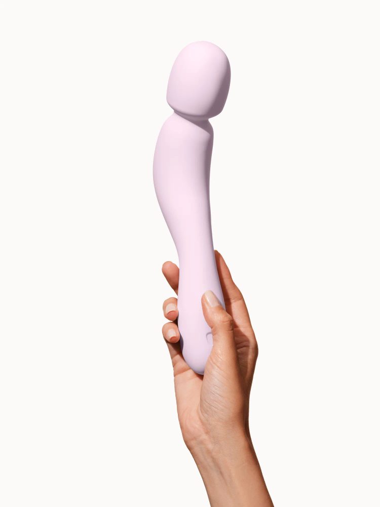 PLNÁ POTĚŠENÍ – Kulatá hlava hůlkového vibrátoru Dame Products Com hladí klitoris i jeho okolí. Vaše vulva bude potěšena! se širokým duněním.