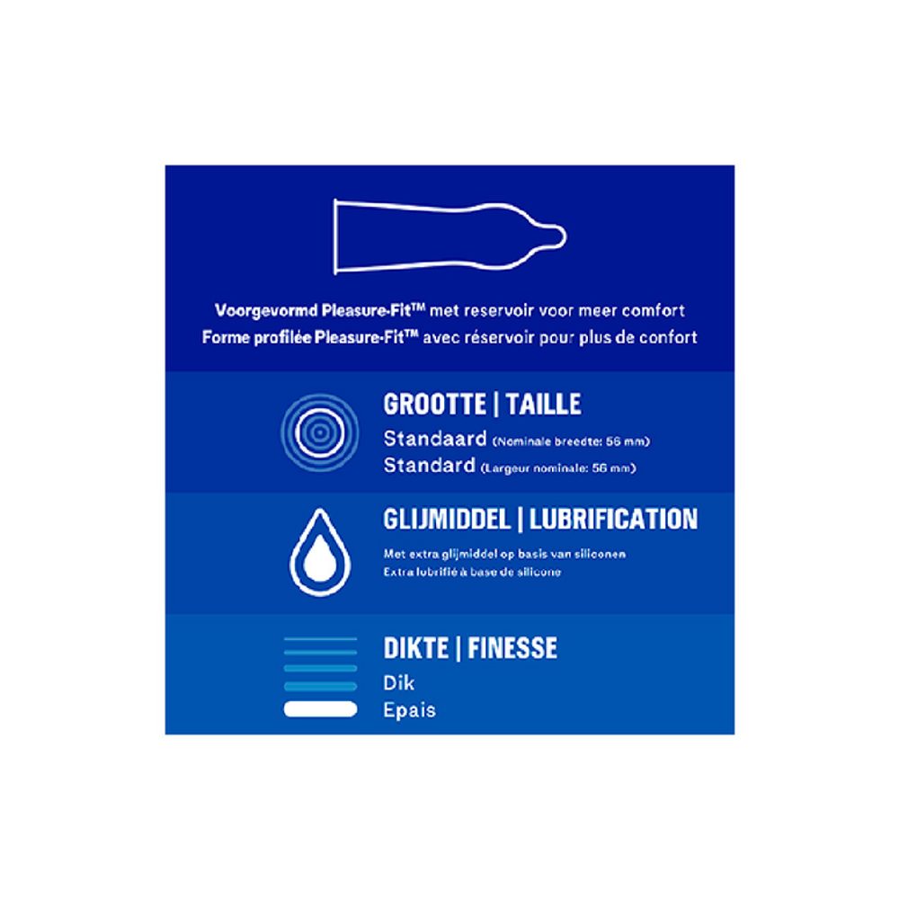 Kondomy Durex Extra Safe jsou navrženy pro poskytnutí maximální ochrany během sexu. Jsou vyrobeny z lehce silnějšího latexu a lubrikovány silikonovým lubrikačním gelem. Kondomy Extra Safe nabízí pocit většího bezpečí, aniž byste se vzdali potěšení, navíc ve výhodném balení.