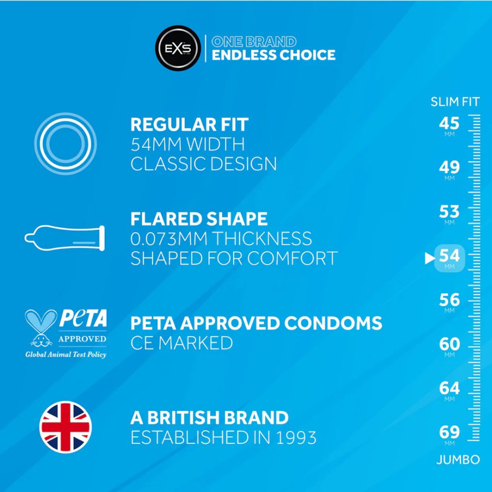 EXS Regular je kondom s 54 mm šířkou a rozšířeným zakončením na špičce, vhodný pro většinu mužů, kteří chtějí používat kondom s jistotou a bez kompromisů. Tento kondom je vyroben z tenkého, ale pevného hedvábného latexu, který nemá nepříjemný latexový zápach a přináší přirozený pocit při styku.