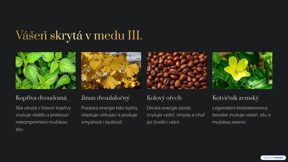 Obsah jednoho sáčku rozmíchejte ve 200–250 ml vody a vypijte. Účinek se dostavuje přibližně do 30 minut.Složení: skořice kůra, oves setý, moruše melasa, rohovník obecný, galgán lékařský, řeřicha peruánská (MACA), ženšen americký, kopřiva dvoudomá, ženšen sibiřský, jinan dvoulaločný, kolový ořech, kotvičník zemský, květový med.