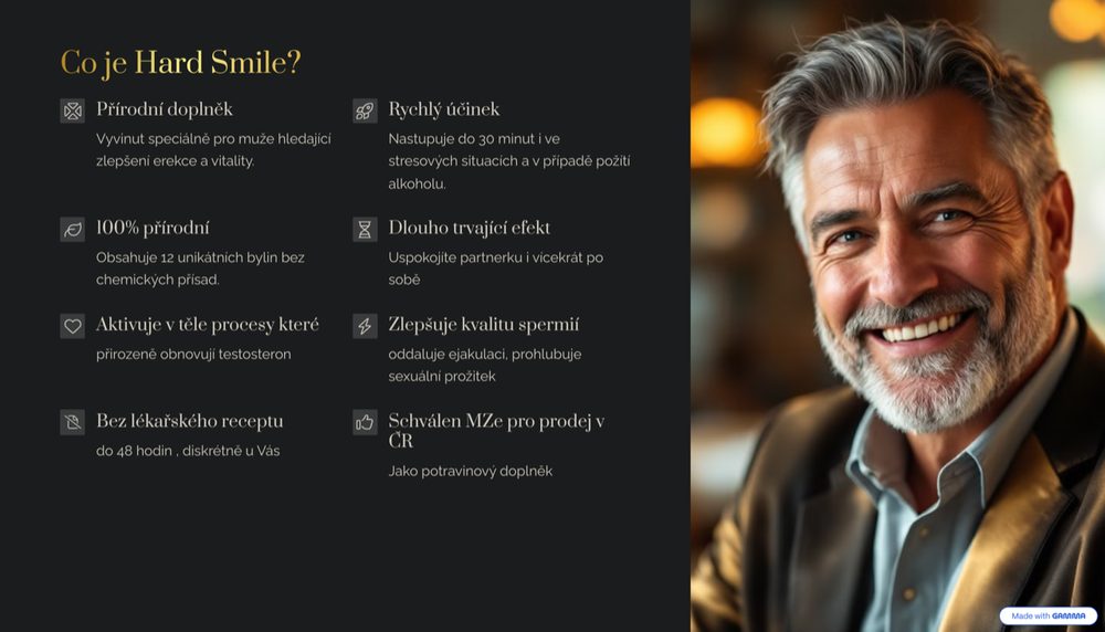 Hard Smile je doplněk stravy s obsahem 12 přírodních bylin, které podporují erekci, zvyšují sexuální prožitek a přirozeně stimulují libido. Produkt je vhodný i při stresu, únavě nebo po požití alkoholu.