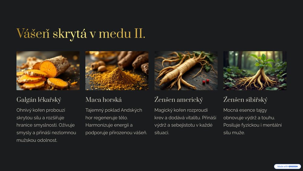 Obsah jednoho sáčku rozmíchejte ve 200–250 ml vody a vypijte. Účinek se dostavuje přibližně do 30 minut.Složení: skořice kůra, oves setý, moruše melasa, rohovník obecný, galgán lékařský, řeřicha peruánská (MACA), ženšen americký, kopřiva dvoudomá, ženšen sibiřský, jinan dvoulaločný, kolový ořech, kotvičník zemský, květový med.