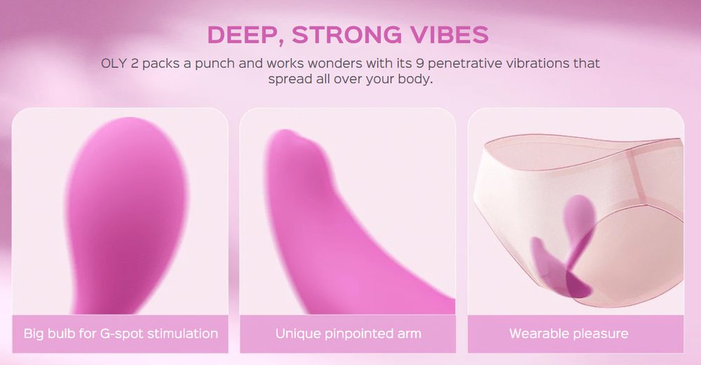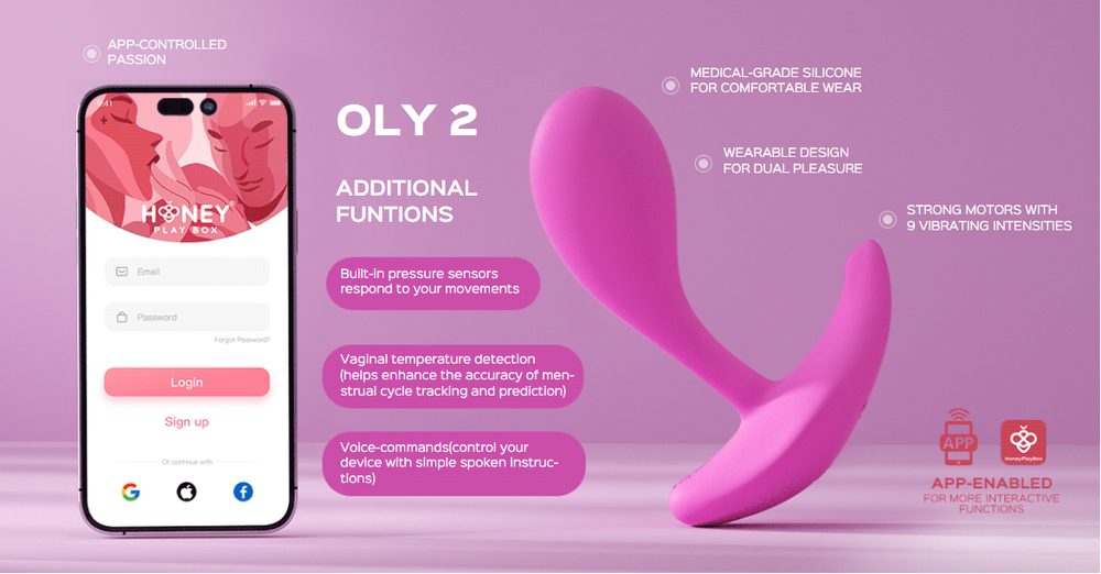 Oly 2 od značky Honey Play Box je všestranná hračka pro potěšení, která poskytuje současnou stimulaci bodu G a klitorisu a nabízí intenzivní potěšení a nezapomenutelné orgasmy. Obsahuje 6 vestavěných tlakových senzorů. Čím větší tlak, tím silnější vibrace. Detekce vaginální teploty zase napomáhá zlepšit přesnost sledování a predikce menstruačního cyklu. Nejen, že si můžete užít 9 intenzit vibrací při sólové hře, ale váš partner může převzít ovládání. Drobné tělo Oly 2 z něj dělá jednu z nejlepších haček, nositelný stimulátor klitorisu a bodu G, ergonomicky přizpůsobený anatomii vulvy, se vám pohodlně vejde do kalhotek.