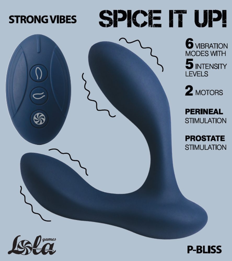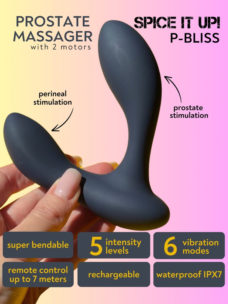 Spice it Up P-Bliss je zcela flexibilní voděodolný masážní přístroj na prostatu, vyrobený z lékařského silikonu, který nabízí kombinaci potěšení a zdravotní prospěšnosti. Tento masážní přístroj zvyšuje potenci, zlepšuje ejakulaci a obohacuje sexuální život o nové pocity. Dva vibrační motory s 6 vibračními vzory a 5 intenzitami vytvářejí příjemné a intenzivní zážitky. Anatomicky tvarovaná penetrační část se zakřivenou špičkou a ideálními rozměry zajišťuje, že dosáhne na citlivé oblasti každého uživatele. Masér se nabíjí pomocí USB nabíječky, dálkové ovládání má dosah až 7 metrů. Pracovní doba: 90 minut, Doba nabíjení: 120 minut.