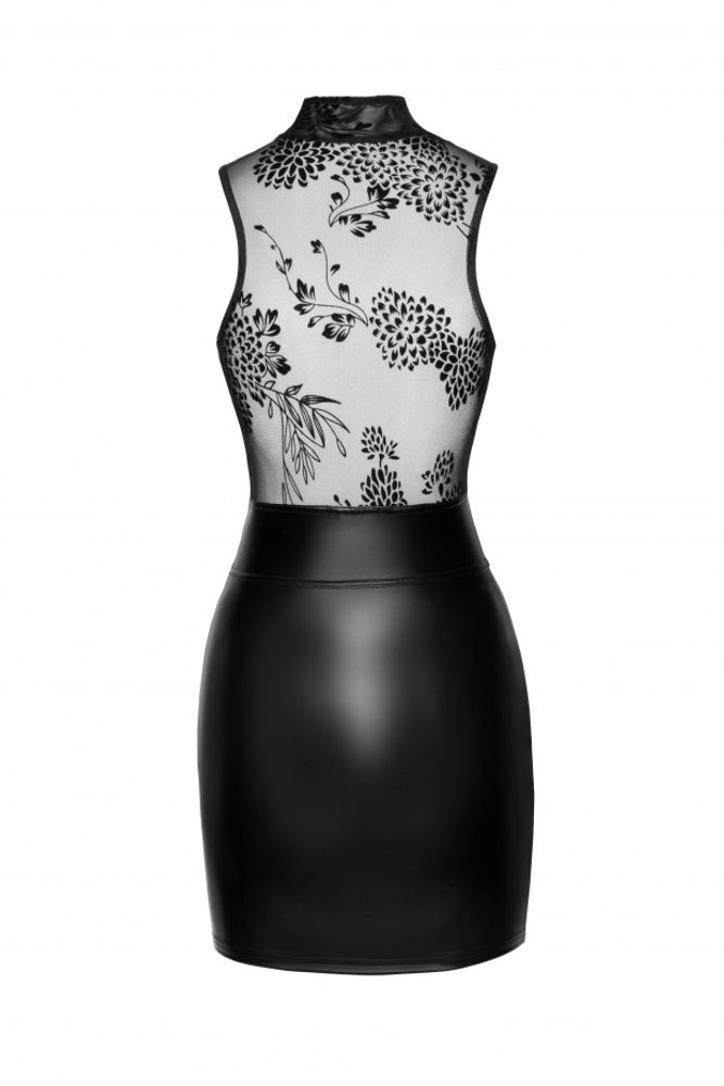 Úchvatné krátké šaty se sukní Powerwetlook a vzorovaným tylovým topem s hlubokým výstřihem. Tento vzhled je klasický i tantilizující.