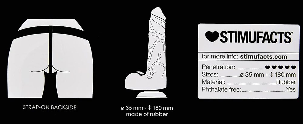 Rozměry: Dong měří 7 palců na celkovou délku, 6 palců vkládací, 1,37 palce na největší průměr. O-kroužek má šířku 2 palce. Postroj má obvod 31 palců, nenatažený.
