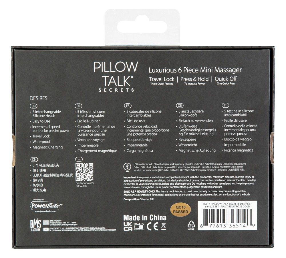 Rozšiřte svůj svět touhy pomocí 6dílné sady Pillow Talk Secrets Set Desires! Tato luxusní sada je skvělým výchozím bodem pro každého, kdo chce prozkoumat smyslný a intenzivní svět kulových vibrátorů. Desires, poháněný neuvěřitelným motorem PowerBullet, vám poskytuje hluboké vibrace při rychlostech od mírných až po divoké. Postupnou rychlost lze snadno ovládat stisknutím a podržením tlačítka na základně. Máte pod kontrolou svou úroveň potěšení! Desires obsahuje 5 vyměnitelných silikonových hlav, z nichž každá má svůj vlastní jedinečný tvar a pocit. Klasická hlavice rtěnky nabízí hladkou, šikmou špičku pro senzační pokrytí povrchu. Špička Pinpoint má úzkou kuličku pro přesný přenos vibrací a špička Dual Pinpoint má dvě kuličkové špičky pro dvojnásobnou přesnost a je ideální pro hru bradavek. Grooved Orb má kulaté drážky, které přenášejí vibrace do vln kousání rtů blaženosti. Nakonec má hlava lechtadla 8 měkkých prstů uspořádaných do kruhu, aby dráždily a lechtaly bradavky nebo jiná citlivá místa. Každou hlavu lze tahem sejmout z kulové základny a zatlačením nasadit zpět. Jsou vyrobeny ze 100% tělu bezpečného silikonu a snadno se čistí.