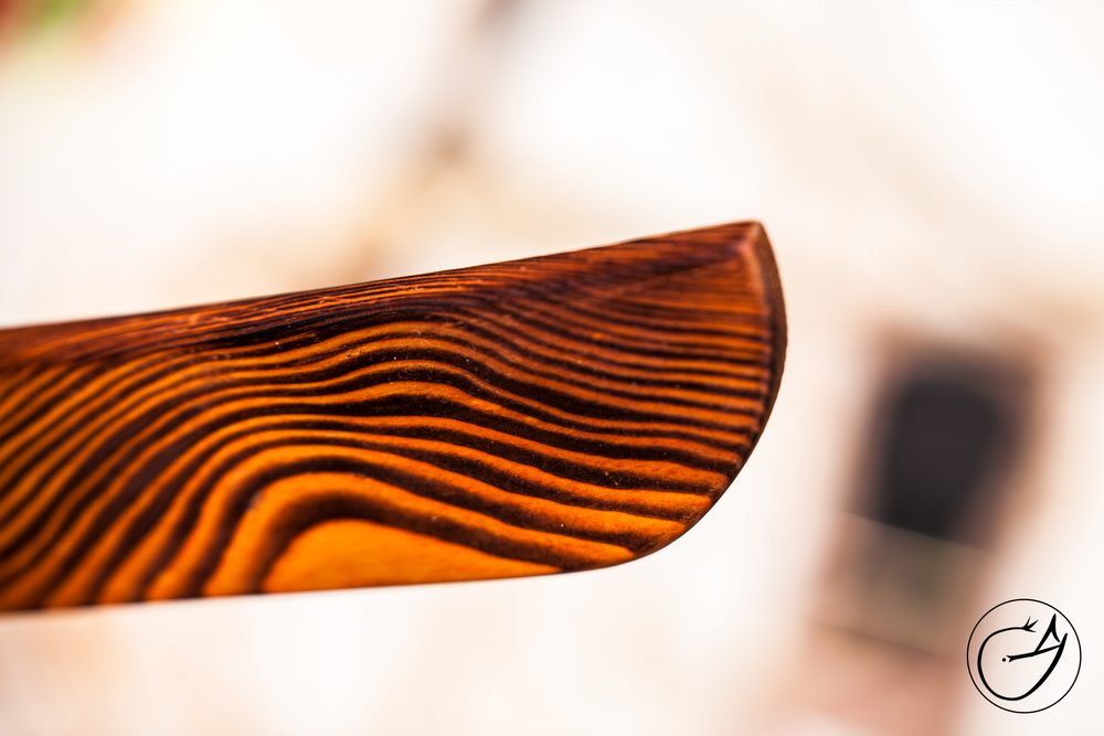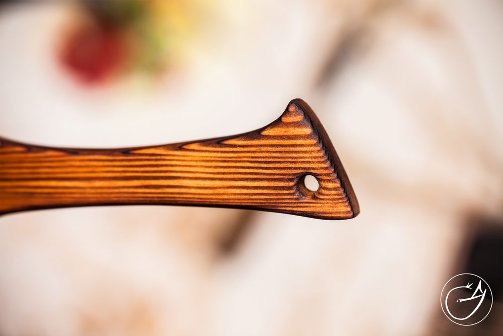 Originální plácačka je vyrobena z jasanu, tvrdého dřeva, které má samo o sobě krásnou kresbu s nádechem do oranžové.