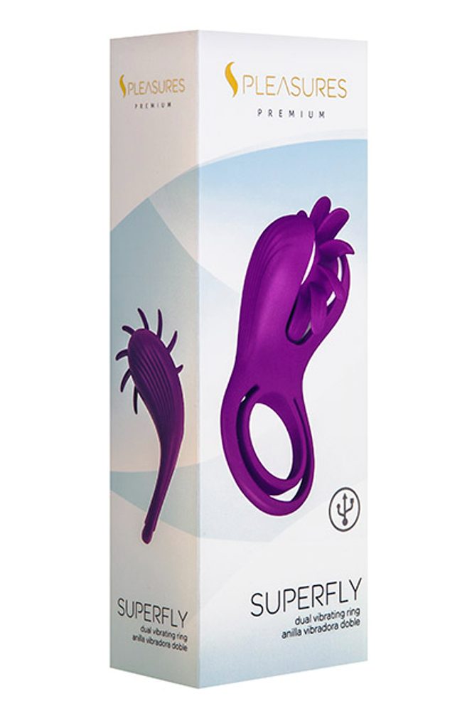 Superfly od značky S Pleasures Premium Line je fialový dvojitý vibrační kroužek vyrobený z lékařského silikonu bezpečného pro tělo a ABS, s velmi jemným dotykem.