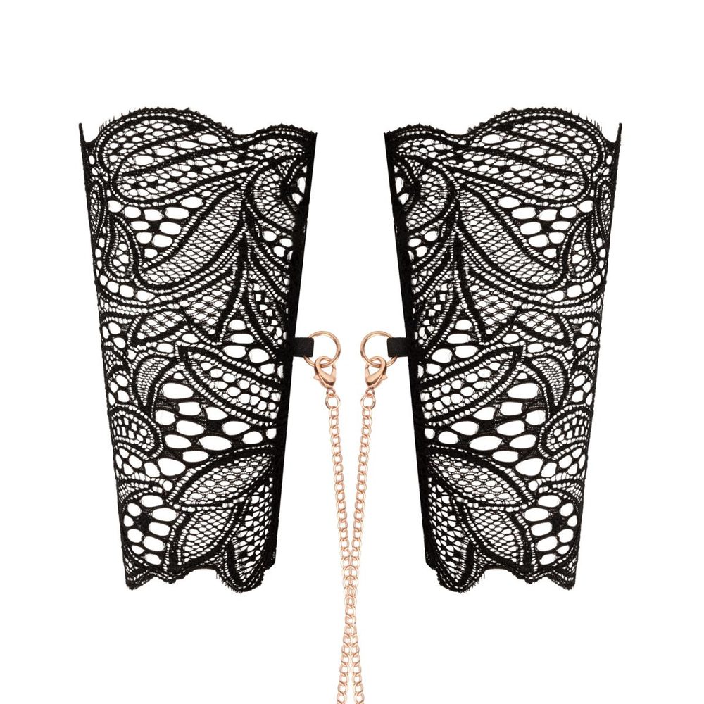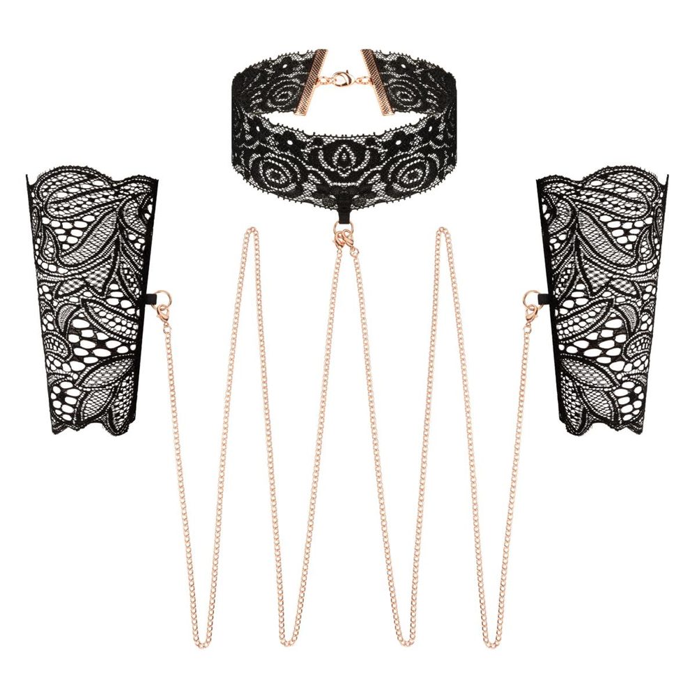 Zahalte se do kouzla jemné krajky a třpytivého zlata. Tato luxusní sada obsahuje delikátní krajková pouta na ruce a odpovídající límec, propojené nádhernými zlatými řetízky, které dodávají celé kombinaci nádech sofistikované smyslnosti.