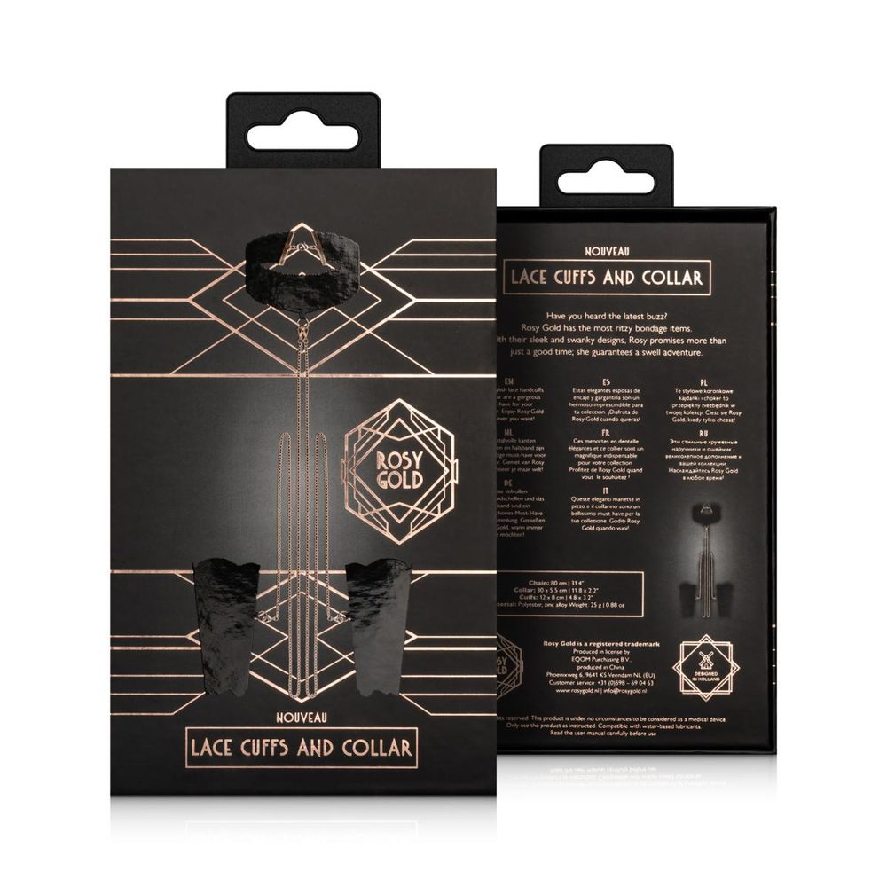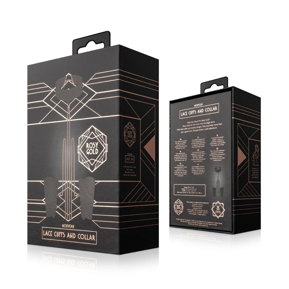 Zahalte se do smyslné krajky a elegantního zlata. Tato souprava obsahuje jemná krajková pouta na ruce a odpovídající límec, které jsou spojeny krásnými zlatými řetízky. Při každém nošení vyzařujte eleganci, půvab a nádech tajemna. Ať už je budete nosit dohromady, nebo samostatně, tyto kousky dodají každému vzhledu tu správnou dávku sex-appealu. Tato sada je ideální pro odvážné vyjádření nebo dodání jemného nádechu elegance vašemu kompletu, abyste na sebe upozornili a upoutali pozornost.
