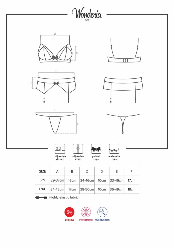 Úžasný design, smyslné krajky, koketní pásky, rozkošná mašlička a spousta sex-appealu. Wonderia setÚžasný design, smyslné krajky, koketní pásky, rozkošná mašlička a spousta sex-appealu. Wonderia se k vám hodí perfektně! Přidáme i špetku vaší pikantní fantazie. Teď je to prostě perfektní! A jste připraveni na další žhavé noci. Budou plné sladkých rozpustilostí mezi vámi dvěma!Poznejte podrobnosti a začněte s hravou zábavou:- smyslná sada pro sexy svůdnice- kosticemi vyztužená podprsenka – dokonale zvedne poprsí- nastavitelná ramínka a nastavitelné zapínání – snadno se zapíná- podprsenka vyrobena z jemné krajky, rozkošného a hladkého materiálu – svůdně zdůrazní poprsí- výstřih zdobí pikantní, elastické pásky- koketní mašlička mezi košíčky podprsenky- krajkový a měkký materiál podvazkového pásu- hravá mašlička a krajkové pásky na přední straně podvazkového pásu – sexy detaily- krajková zadní část podvazkového pásu – pikantní, zdůrazní hýždě- vyhovující, krajková tanga- pěkný, pružný materiál (90% polyamid, 10% elastan)
