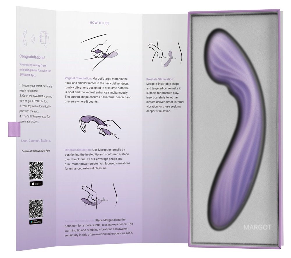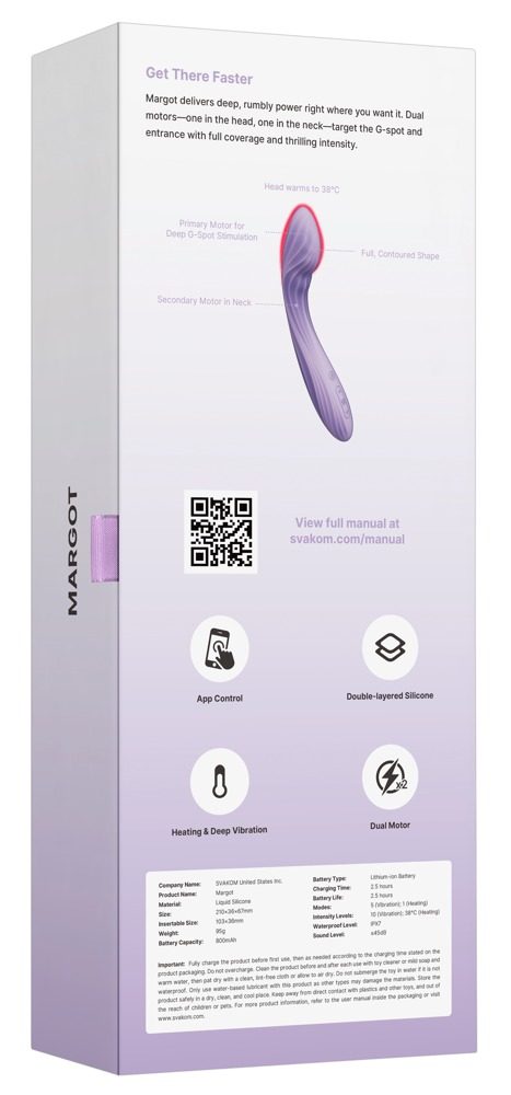 Dva motory, jedna mise Silné vibrace se zaměřují na váš bod G a klitoris a přinášejí vám všestranné uspokojení. <p class="sc-feopBa gVincu rid-7 pf-text-4" data SVAKOM Margot – dvojitá stimulace, dvojnásobné potěšení Vstup do světa intenzivních vjemů s vibrátorem Margot, který díky dvěma výkonným motorům současně stimuluje bod G i klitoris. Bohaté, hluboké vibrace se přirozeně prolínají a vytvářejí plynulý rytmus rozkoše, zatímco sametově hebké silikonové tělo zajišťuje maximální komfort při každém doteku. Pro ještě smyslnější zážitek se špička zahřívá až na příjemných 42 °C, čímž zvyšuje citlivost a prohlubuje prožitek. Potřebuješ rychlý nástup intenzity? Jediným stiskem přepneš Margot na nejvyšší výkon a užiješ si okamžitou dávku silných vibrací. Přesto zůstává tichý chod ideální pro diskrétní použití kdykoliv a kdekoliv. Margot je navržený pro pohodlné každodenní používání – je voděodolný, dobíjí se přes moderní USB-C konektor a disponuje funkcí paměti i cestovním zámkem. Propojení s SVAKOM App ti umožní vytvářet vlastní vibrační vzory, hrát si sólo nebo přizvat partnera na dálku.