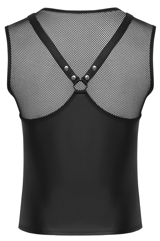 Odhalte svou sílu a styl v této bezešvé košili ve stylu hrudního postroje, která dokonale zvýrazní vaši postavu. Matný černý materiál v kombinaci s provokativní síťovinou vytváří neodolatelný kontrast, zatímco dekorativní kovové detaily, cvočky a kroužky dodávají dominantní a odvážný vzhled.