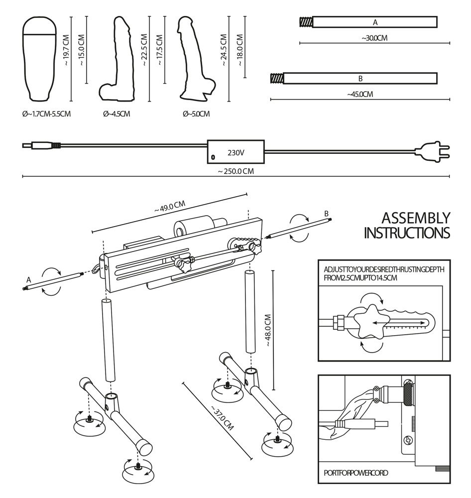 - Sexuální stroj 49 cm x 48 cm x 37 cm. Kov, ABS, PVC, TPE.