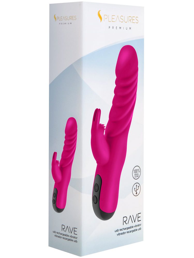 Rave je polorealistický vibrátor typu „králíček“ pro duální stimulaci v malinové barvě, vyrobený z lékařského silikonu a ABS plastu.