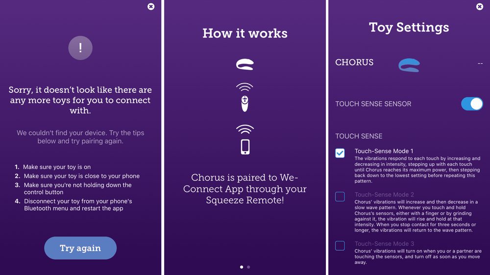 ![]() | Nastavitelný střih Chorus, který se nosí při sexu, je nastavitelný tak, aby se přizpůsobil vašemu jedinečnému tělu, takže můžete cítit vibrace přesně tam, kde je chcete. Tvar se snadno přizpůsobuje a zůstane na místě. | ![]() | Squeeze Remote Měňte intenzitu v okamžiku. Dálkové ovládání Chorus‘ Squeeze je navrženo s ohledem na nejpřirozenější lidskou odezvu – čím pevněji stisknete, tím silnější budou vibrace. | ||||||||||||||||||||||||||||||