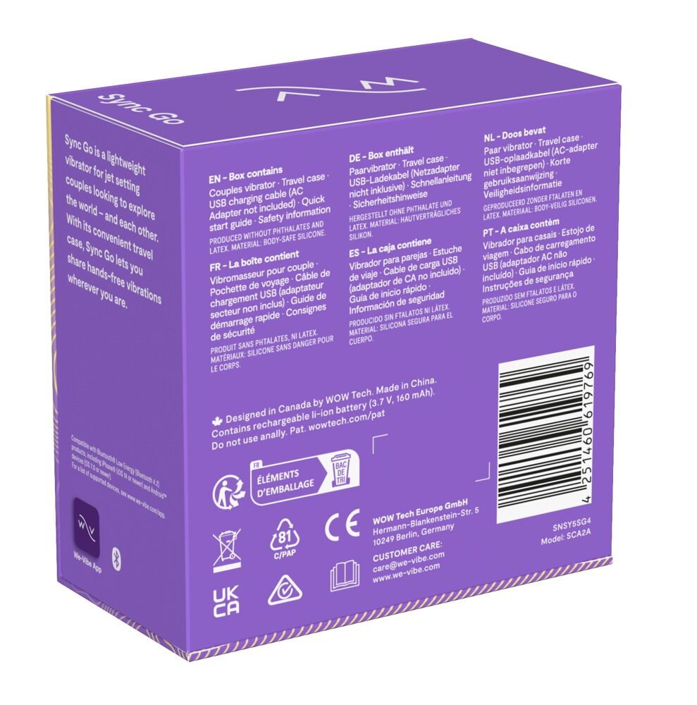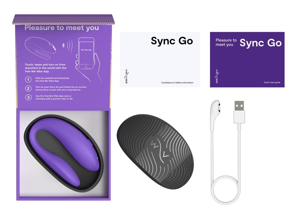 Sync Go je kompatibilní s aplikací We-Vibe pro IOS a Android přes Bluetooth. Zde si můžete vytvářet individuální stimulační programy a ovládat vibrace pohodlně přes chytrý telefon. K dispozici jsou také vibrace do rytmu hudby. Aplikace We-Vibe také umožňuje sexuální blízkost na dálku. Do aplikace jsou také integrovány další funkce hlasu, chatu a videa. Bavit se kdekoli je možné, protože Sync Go je vodotěsný.