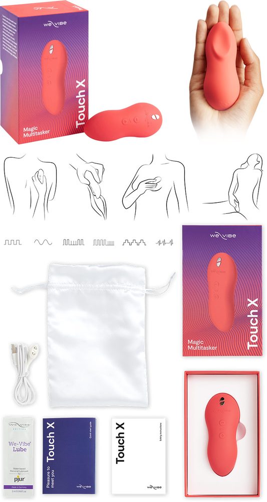 - 1 x vibrátor Touch X, Včetně nabíjecího kabelu USB, úložného sáčku a vzorku maziva.