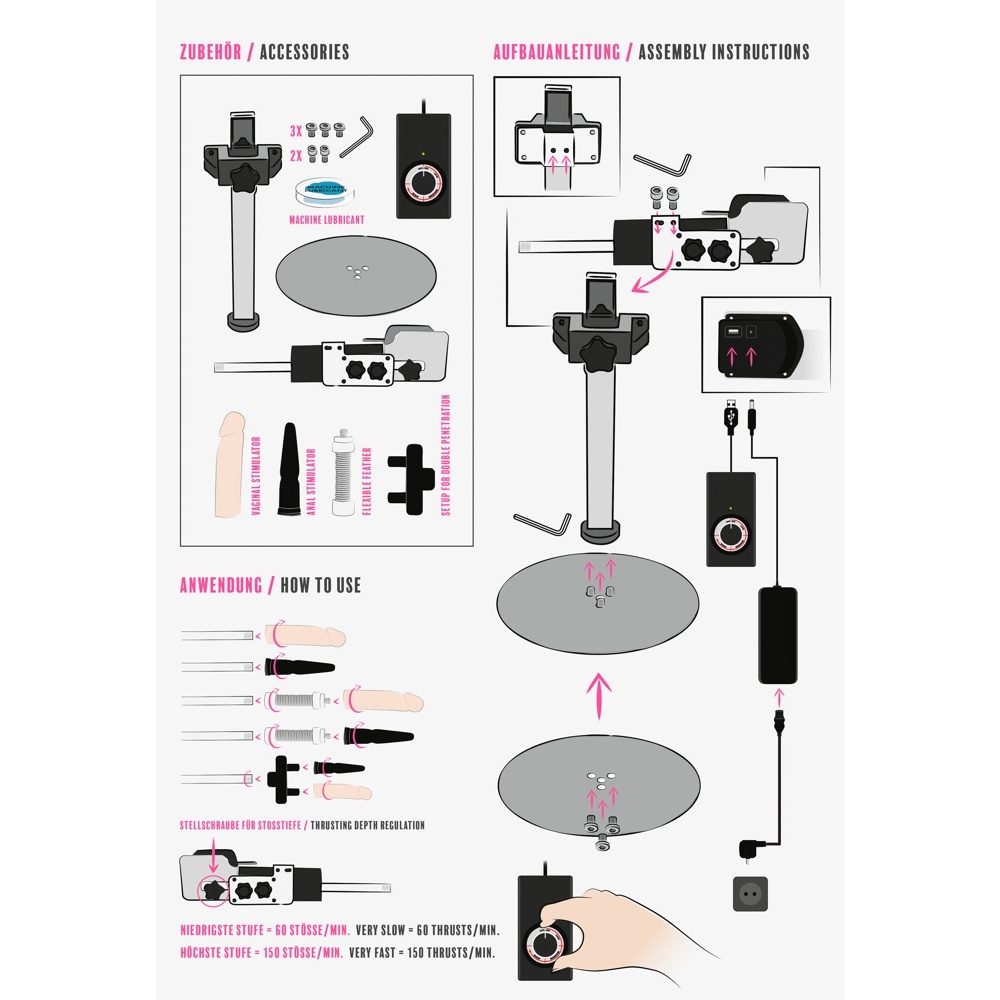 Ten pravý pomocník pro nekonečné potěšení. Neúnavný robotický milenec, kterému není cizí žádná poloha a žádný roztoužený otvor. Zvolte si ideální výšku a úhel a ovládejte rychlost podle momentální chuti. Dilda jsou snadno vyměnitelná a je jen na vás, jestli použijete vaginální, anální nebo obě najednou. Dilda je možné přišroubovat napevno nebo s použitím ohebné redukce.