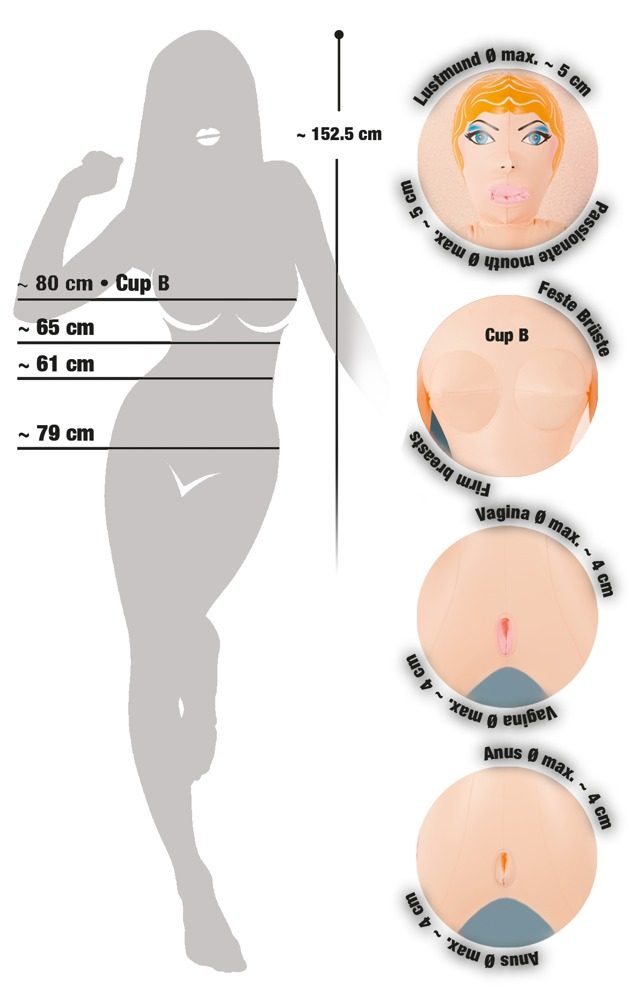 Celková délka 152,5 cm, hloubka vagíny 11 cm, hloubka análního otvoru 13 cm, hloubka úst 11,5 cm. PVC.