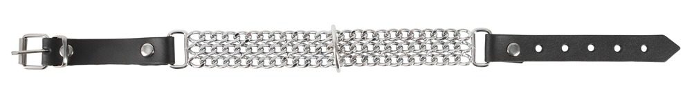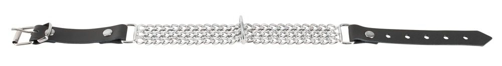 Černý kožený obojek se třemi kovovými řetízky a středovým kroužkem, na který lze upevnit vodítko…to je nový obojek ze štípané hovězí kůže a kovu od značky Zado. Nastavitelný pomocí zapínání na přezku.