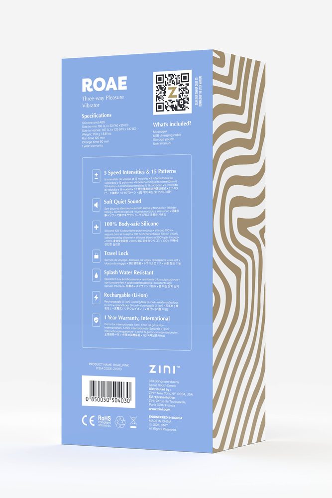 Sofistikovaný králičí vibrátor pečlivě zpracovaný tak, aby poskytoval trojitou stimulaci od značky Zini. Zažijte 5 intenzit rychlosti a 15 vzorů, které vám umožní úplnou kontrolu nad vaší zábavnou cestou. Najděte dokonalý rytmus a vzor, který bude odpovídat vaší náladě. Zatímco jemný, tichý zvuk Roae vás obklopí diskrétním potěšením a zajistí, že váš požitek zůstane zcela intimní a soukromý. Roae je zosobněný luxus, navržený s ohledem na vaši bezpečnost, je vyrobený ze 100% tělu bezpečného silikonu a ABS materiálů. Aktivujte jeho funkci cestovního zámku pro chvíle bez starostí a udělejte z něj perfektního společníka na jakékoli dobrodružství. Je taktéž odolný proti stříkající vodě, bez váhání vás tak zve k prozkoumání intimních požitků ve sprše nebo sauně a umocní vaše smyslné zážitky.