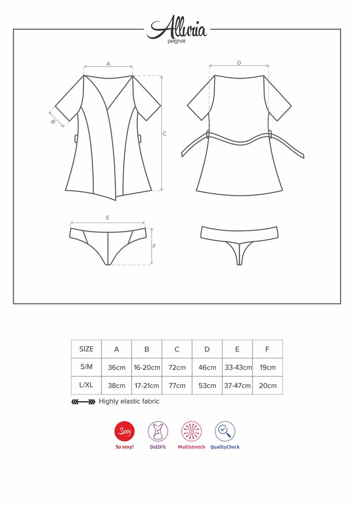 Smyslný outfit pro svůdnou ženu, jako jste vy? Stačí se podívat na tento! Alluria peignoirSmyslný outfit pro svůdnou ženu, jako jste vy? Stačí se podívat na tento! Alluria peignoir má všechny detaily, které se k Vám dokonale hodí. Úžasně jemný design bude krásně pokrývat Vaše tělo. Vše, co musíte udělat, je – obléci se a spustit fantazii na plno. Připravena?Podívejme se na ni blíže:- elegantní peignoir v sexy, vzdušném designu- přední díl a krátké rukávy jsou vyrobeny z krásné, květinové krajky- průsvitný materiál přes boky a na zadní části košilky- peignoir se zavazuji lesklou saténovou stuhou – přesně tak, jak se vám líbí (Did2Fit)!- vyzývavá, krajková tanga zahrnuty- jemný, elastický materiál (94% polyamid, 6% elastan)
